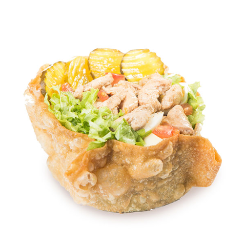 Tortilla en hojaldre integral, 200 grs de filete de pollo en trozos. queso doble crema, lechuga, tomate, cebolla, arvejas, pepinil..