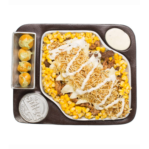 Mazorca desgranada. 125 grs de lomo de res, 125 grs de pollo picado, queso, papas chips y salsa tártara, acompañado de bebida de 4..