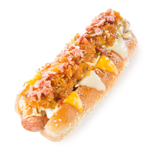Pan perro, salchicha big 100 grs, cebolla, tocineta, piña lacada en trozos, cebolla grillé, queso colby jack, queso dobl..