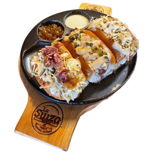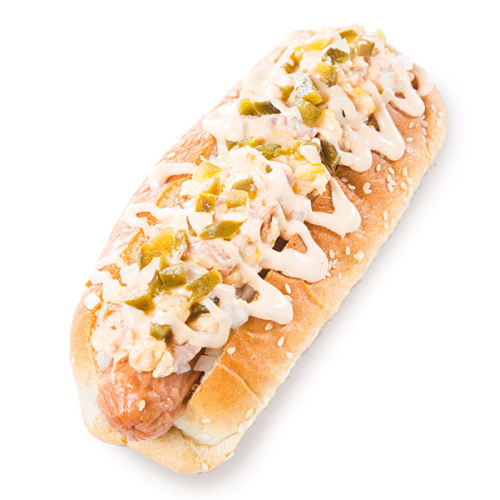 Pan perro, salchicha big 100 grs, cebolla, mazorca, tocineta, queso costeño, salsa chipotle y jalapeños.