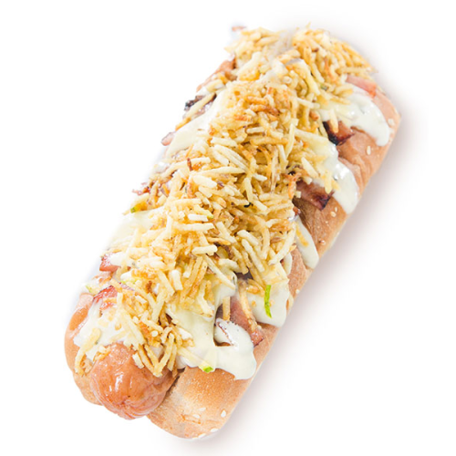 Pan perro, salchicha big 100 grs, queso doble crema, tocineta, cebolla, papas chips y salsa tártara.