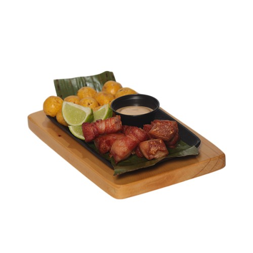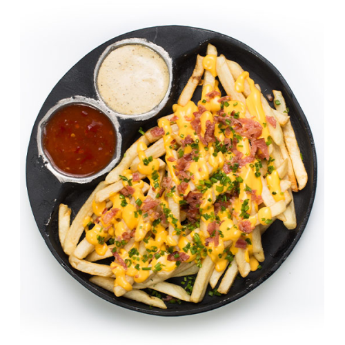 300 grs de papa a la francesa acompañada de tocineta crocante, queso cheddar fundido y cebollin finamente picado, aderezada con sa..